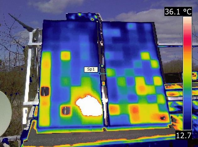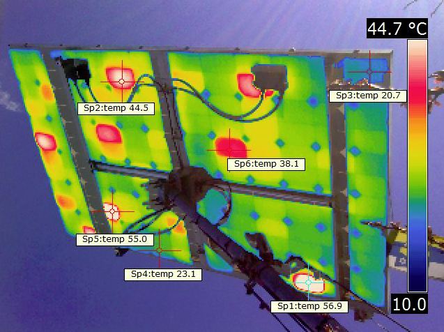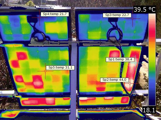 Clusters bei einem PV-Modul. Der weiße Fleck ist die Reflexion der Sonne.